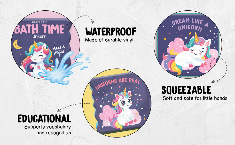 Turn ordinary bath time into an enchanted adventure with "Baby's First Bath Time: Unicorn Book." Full of rainbows, sparkles, and gentle unicorns, this waterproof book makes a magical companion for your baby’s bubbly world.