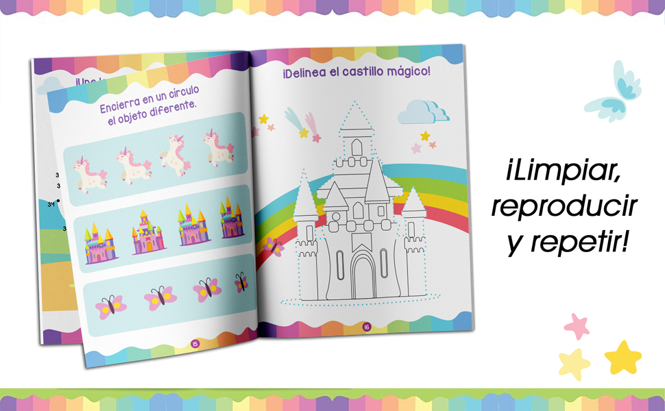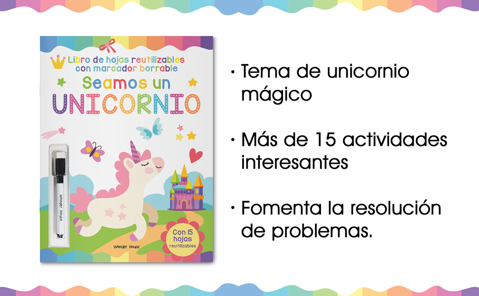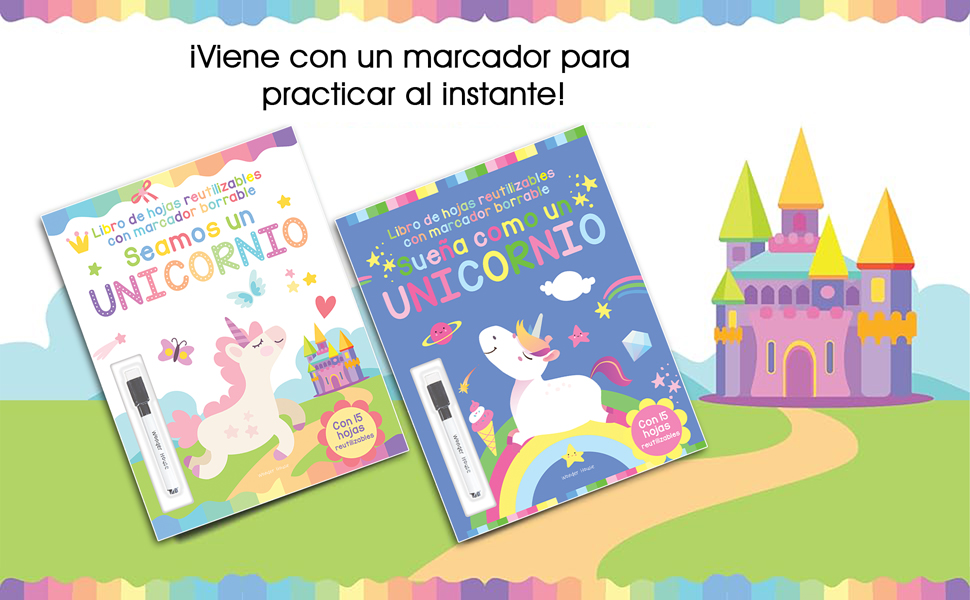 Reusable Wipe and Clean Let's Be a Unicorn Activity Book – Spanish offers endless fun for young unicorn enthusiasts! This interactive activity book features wipeable pages, allowing children to complete a variety of engaging activities in Spanish, such as drawing, tracing, and writing, and then wipe them clean to start again.